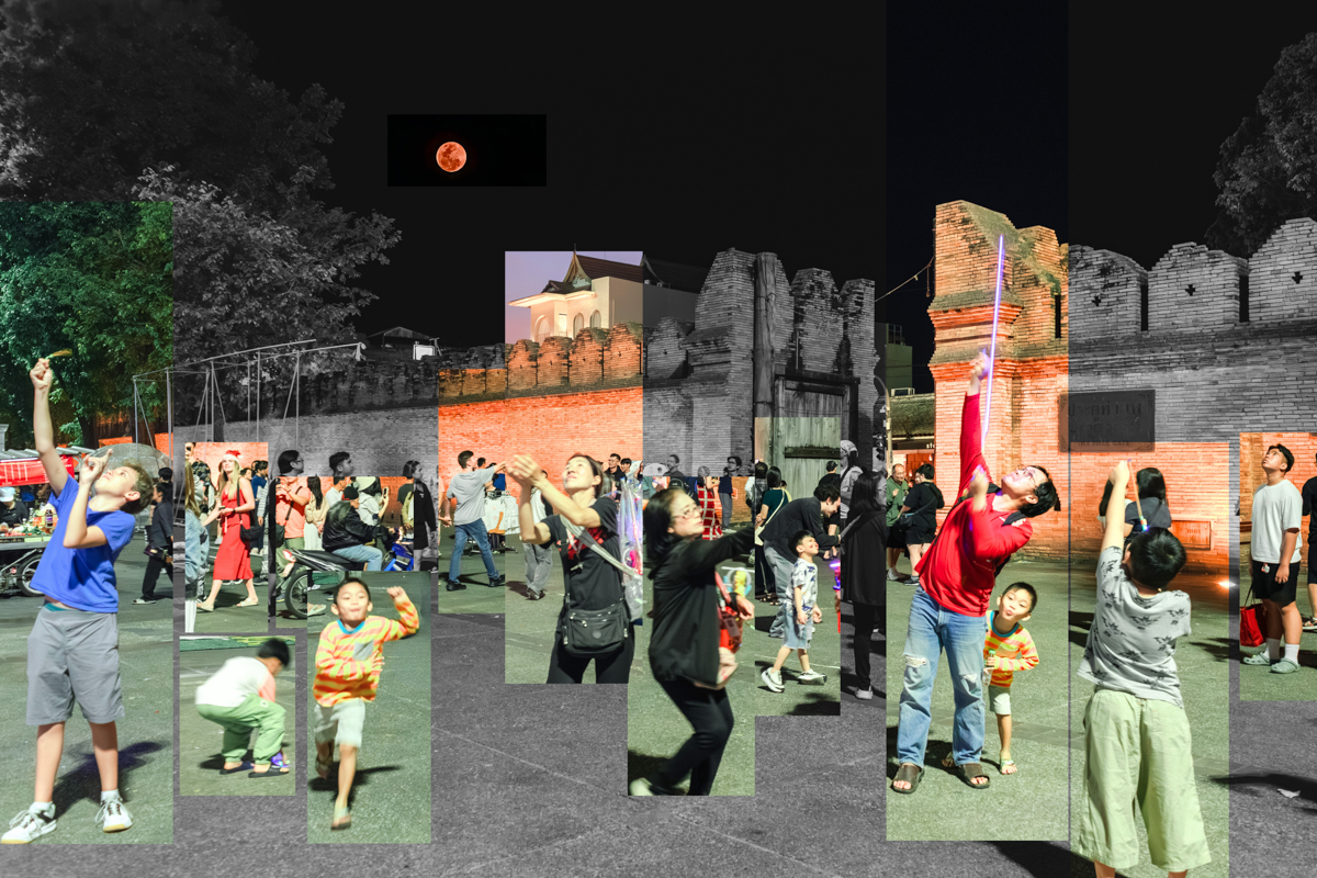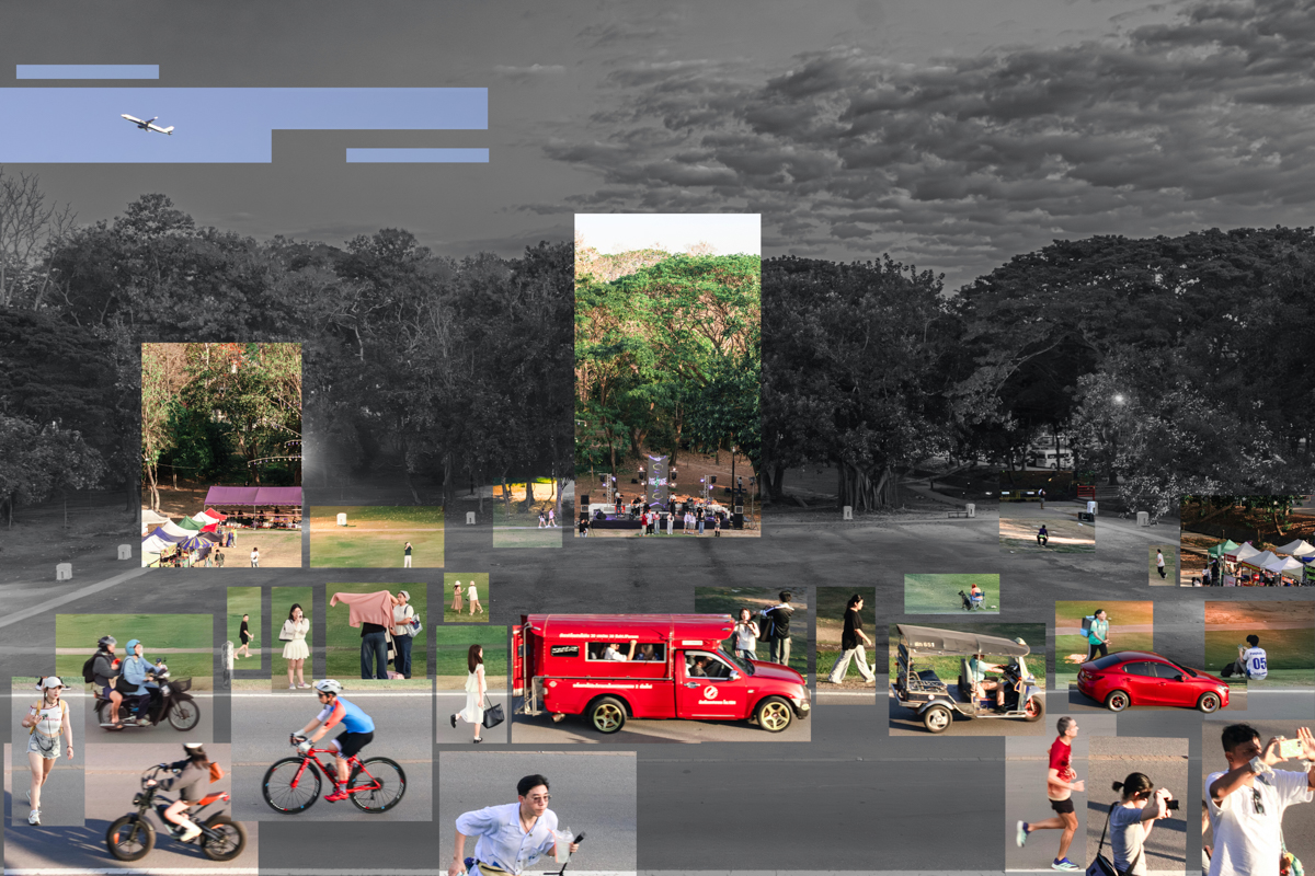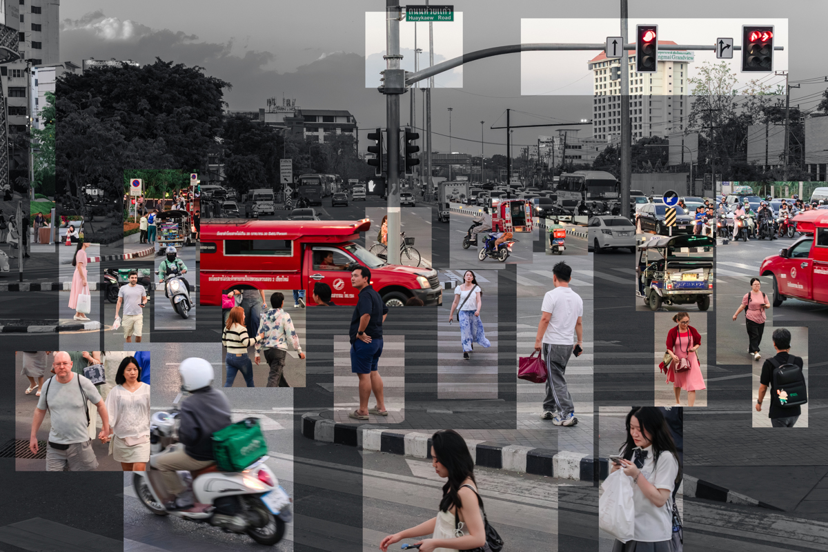 ผลงานปะติด (Collage) ชุดนี้ ถ่ายทอดความหมายของพื้นที่และผู้คน ฉากหลังที่ไร้สีสันเปรียบเสมือนภาชนะที่ว่างเปล่า รอคอยการถูกเติมเต็มให้มีชีวิตชีวาด้วยสีสันจากกิจกรรมผู้คนและเรื่องราว เพราะหากปราศจากเหตุการณ์ สถานที่ก็เป็นเพียงความว่างเปล่า