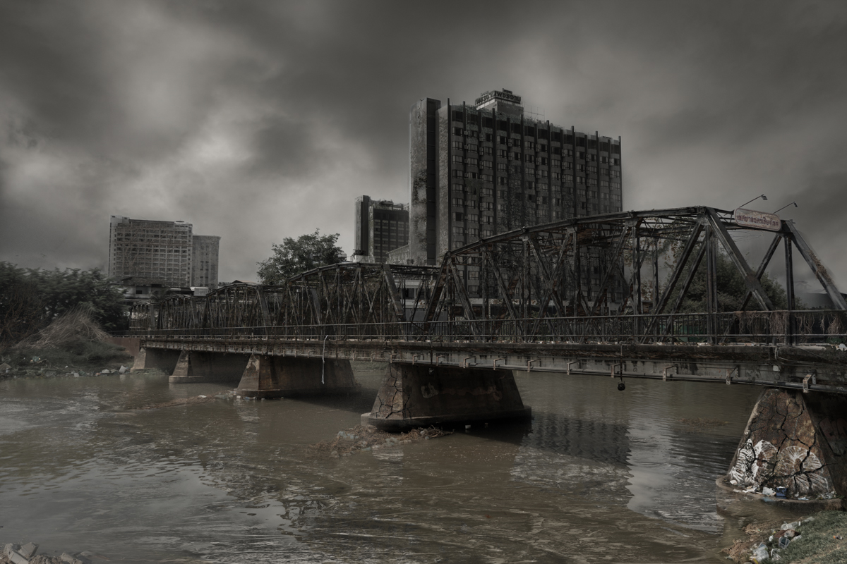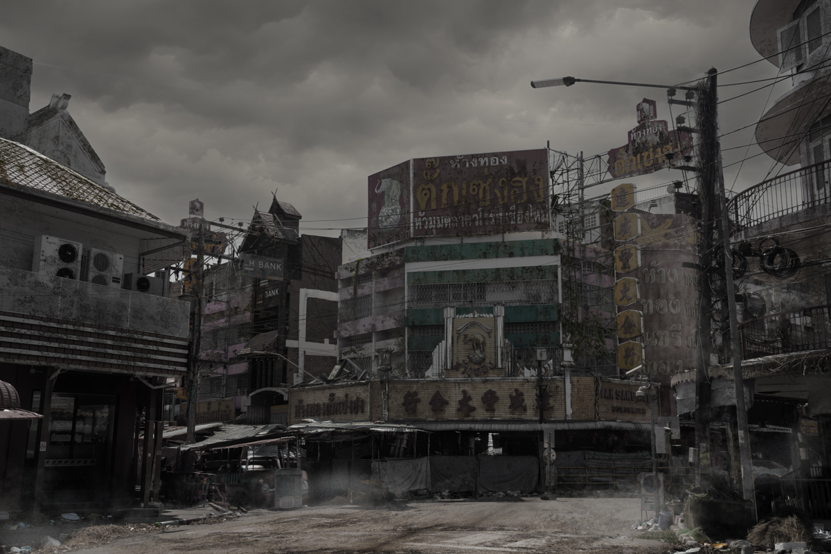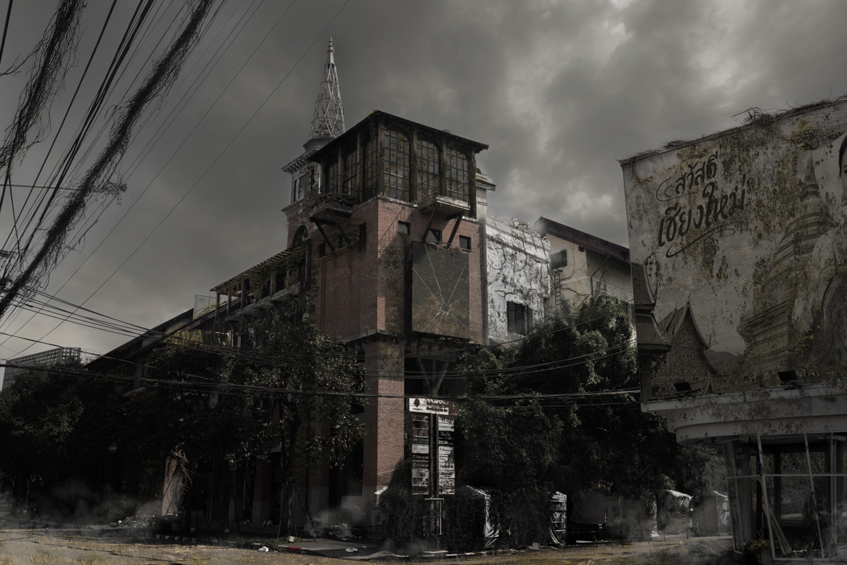 The series is set seven years after the event, a period in which human presence has largely disappeared and nature begins to slowly reclaim the city. The images are photographed in real locations across Chiang Mai and further developed through digital techniques to simulate lighting and atmospheric conditions informed by scientific research on nuclear winter. Human figures are deliberately absent, allowing the environment itself to act as the narrator.